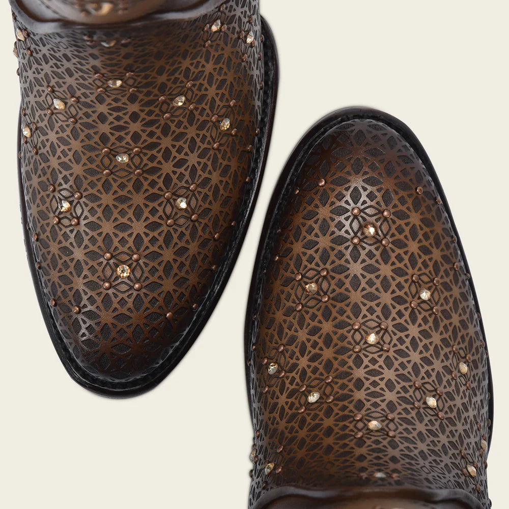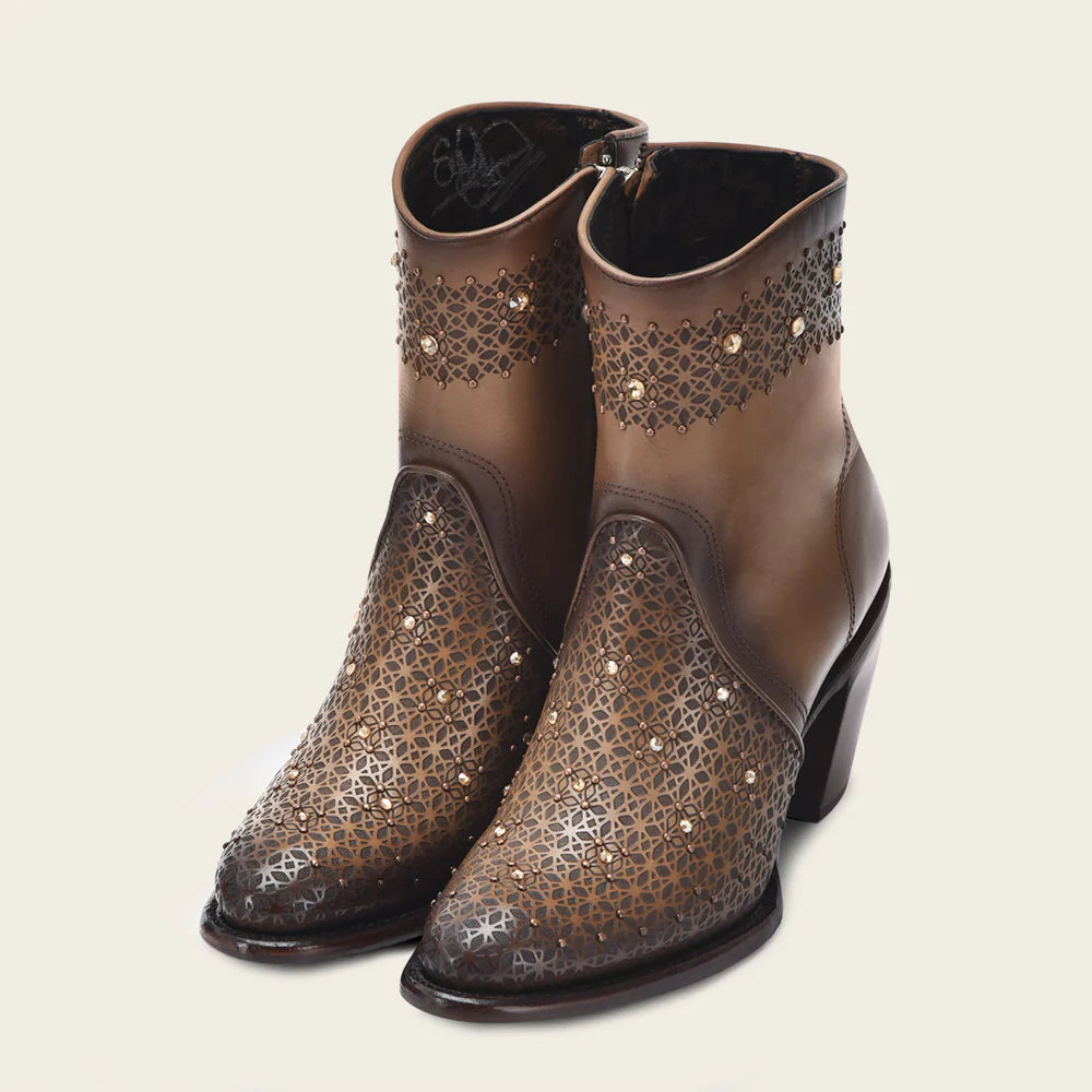 Eleva tu estilo con este impresionante y elegante botín de cuero marrón perforado para mujer. Confeccionado en piel bovina presenta los diseños más destacados: